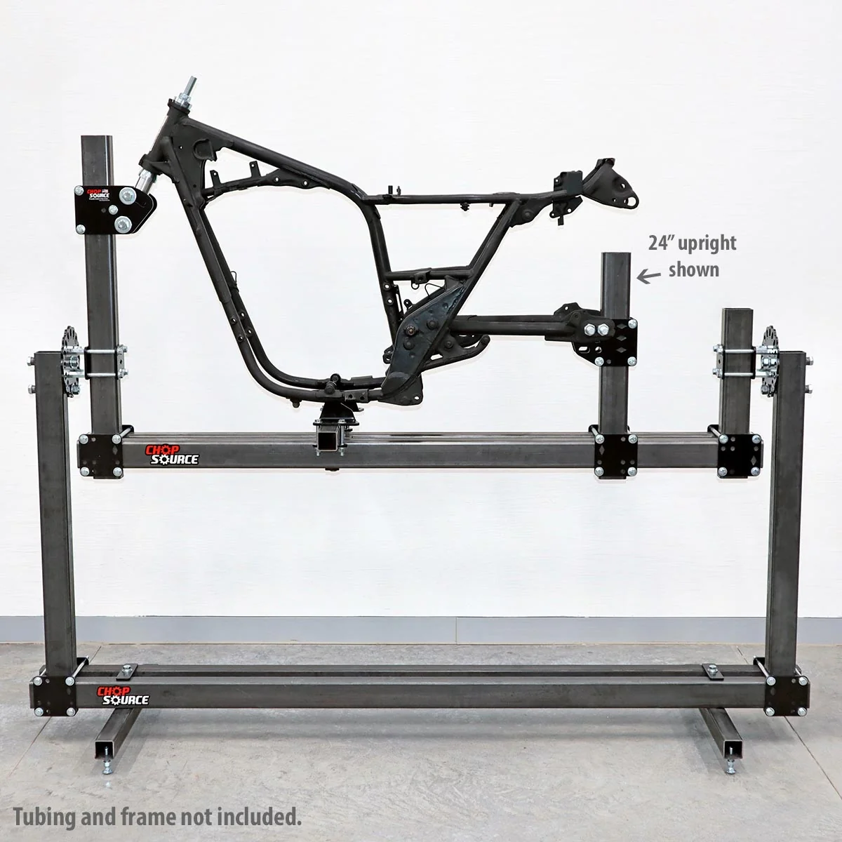Get your motorcycle or bicycle frame jig off the table or motorcycle lift and make it rotate for easier welding with the Chop Source Frame Jig Rotisserie Stand. The brackets lock in 16 positions and can be moved along their uprights to balance the jig and frame. You need to supply 22'2" of 2"x3" or 2"x2" tubing (1/8" wall) for the stand (move the feet from your table-top jig to the stand). See the assembly instructions for more details. Structural tubing can be found at your local metal supply shop or welding/fabricating shop. The rotisserie stand can be built with 2"x2" or 2x3" tubing. Shorter bolts for mounting the rotisserie brackets to 2"x2" tubing are included, but not shown in the product photos.