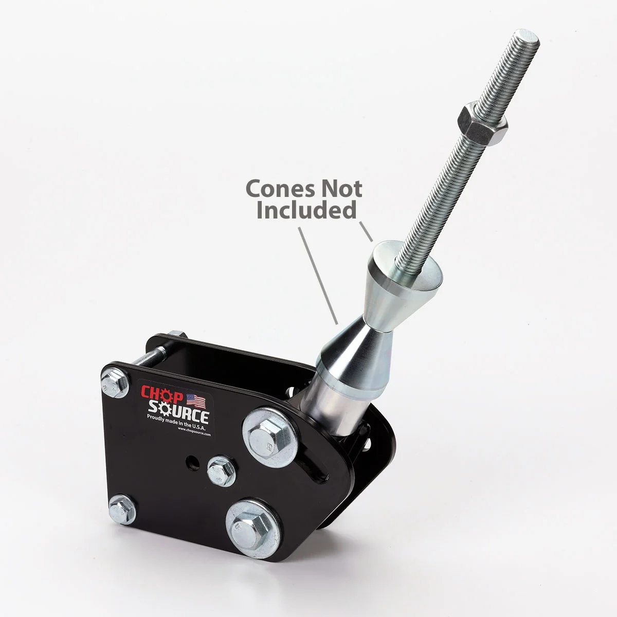 The Chop Source Head Tube Fixture is used to hold the head tube of your bicycle frame in the welding jig. It includes two side plates, a 3/4" threaded rod, rod block, an aluminum threaded spacer, and hardware. The fixture will accommodate head tube angles from 40 to 75 degrees from horizontal. If mounted to a 2"x2" upright, it can go to 90 degrees by flipping around the rod block. The head tube cones are sold separately. The Head Tube Fixture works with both 2"x2" and 2"x3" tubing.